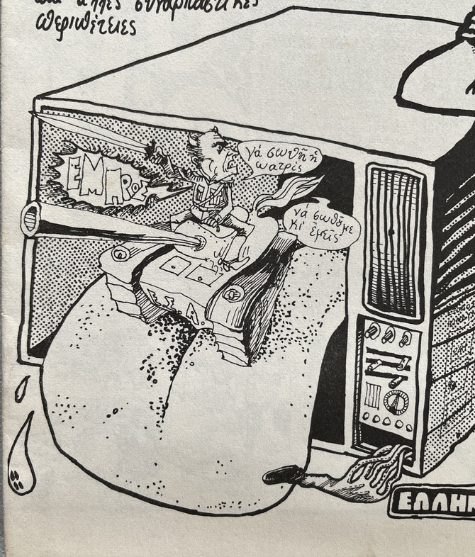 The striking cover—a tank emerging from a television—serves as a powerful metaphor for propaganda and authoritarian control. Interior content includes satirical references to figures associated with the regime, including Dimitrios Ioannidis.