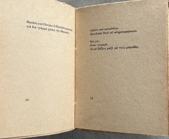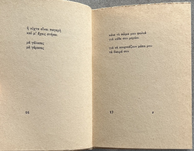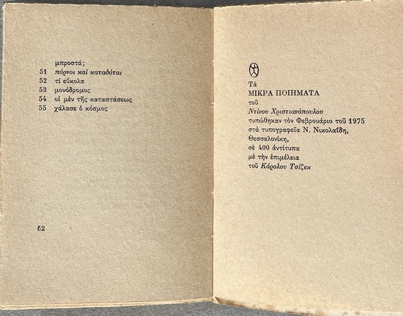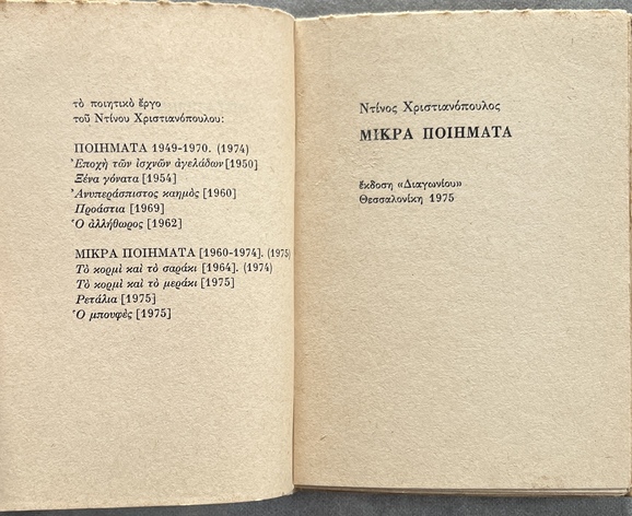 First edition of Μικρά Ποιήματα (1975) by Dinos Christianopoulos (Ντίνος Χριστιανόπουλος), published by Diagonios Editions, Thessaloniki.
