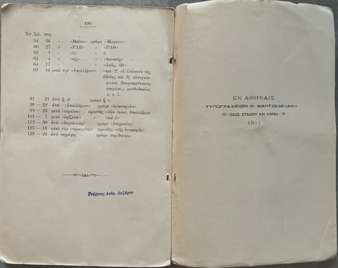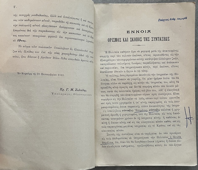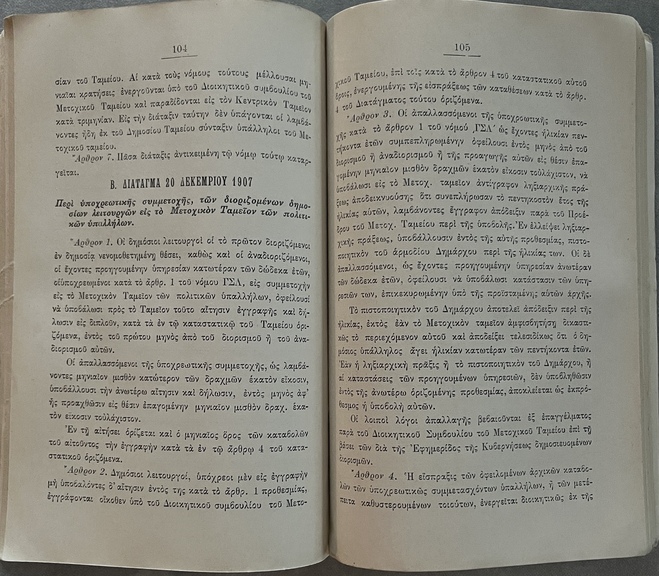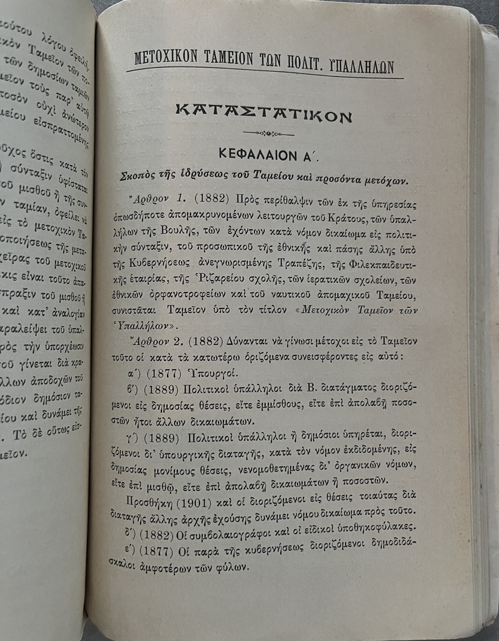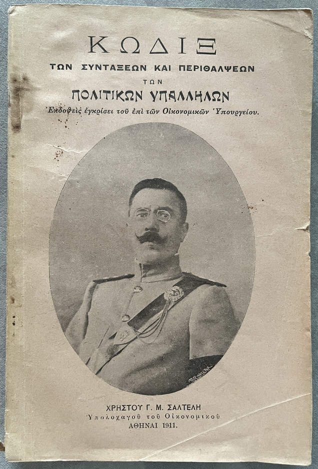 Very rare first edition (1911) of Κώδιξ των συντάξεων και περιθάλψεων των πολιτικών υπαλλήλων (Code of Pensions and Benefits for Civil Servants) compiled by Christos G. M. Saltelis, Lieutenant of the Treasury.