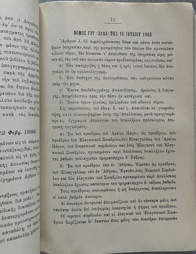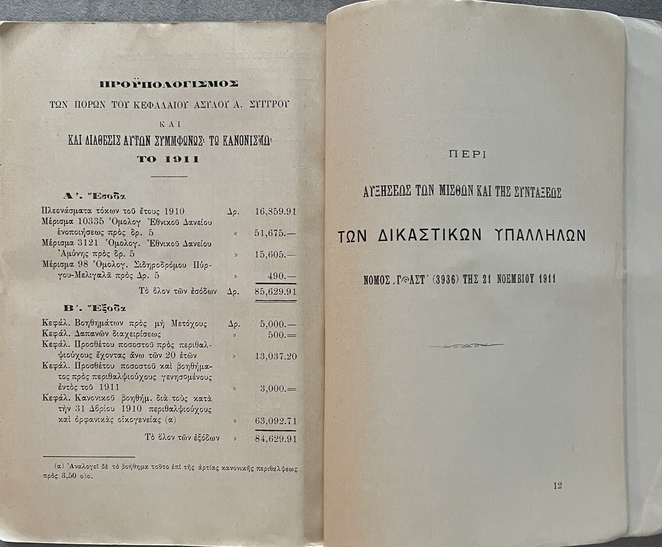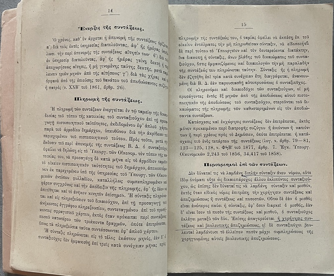 This publication documents early pension law and public-sector benefits in Greece before the Balkan Wars and WWI.