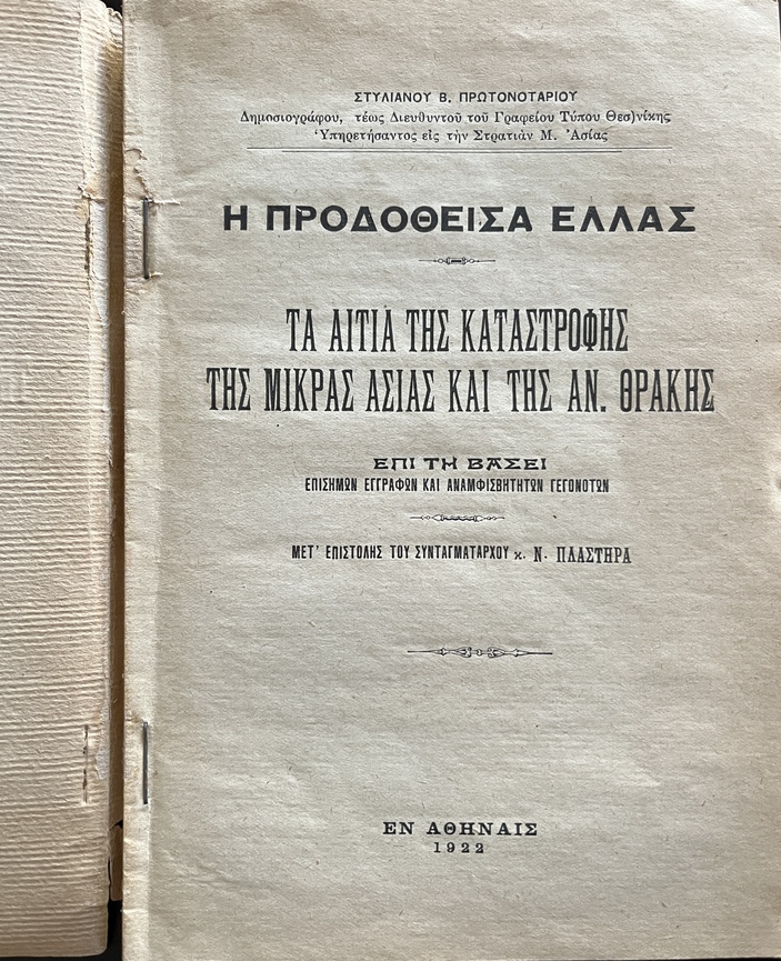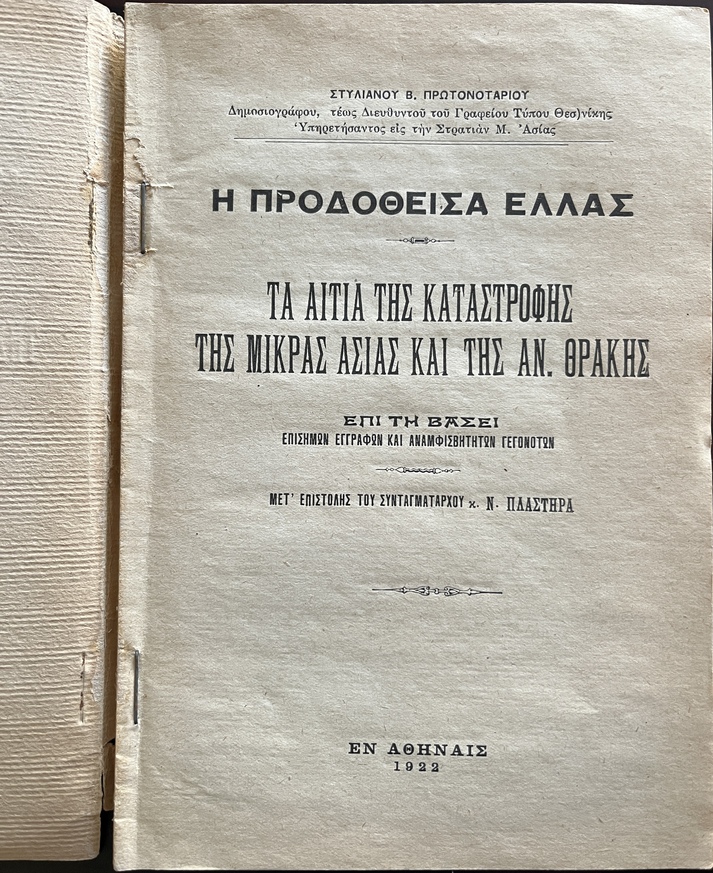 Σπάνιο και ιστορικά σημαντικό βιβλίο με τίτλο Η προδοθείσα Ελλάς: Τα αίτια της καταστροφής της Μικράς Ασίας και της Ανατολικής Θράκης, γραμμένο από τον Στυλιανός Β. Πρωτονωτάριος και εκδοθέν το 1922 στην Αθήνα.