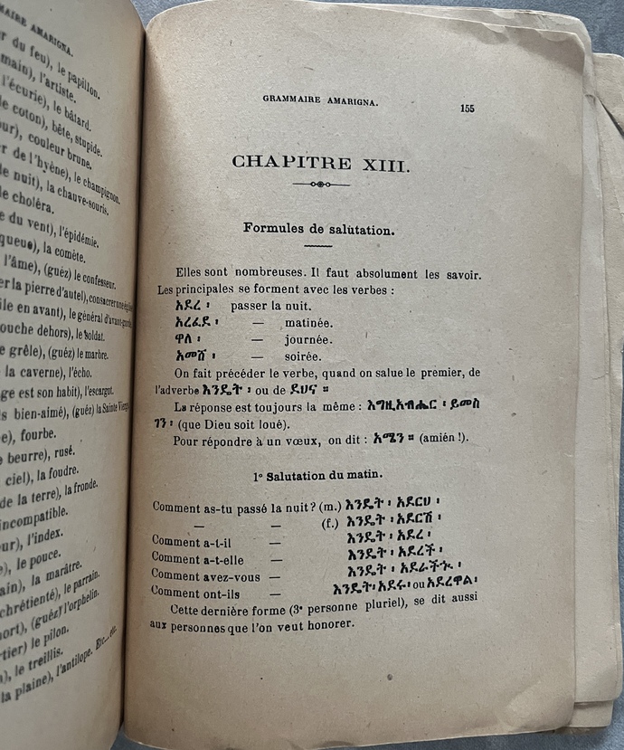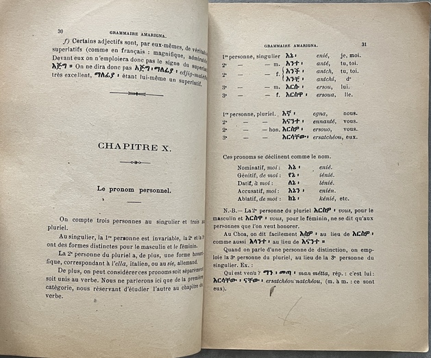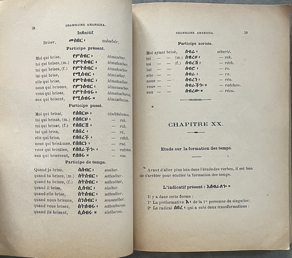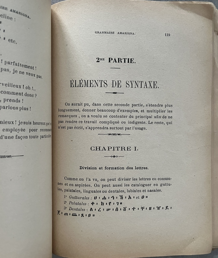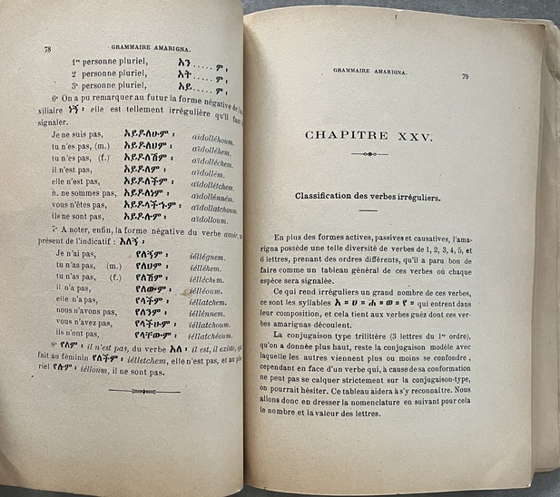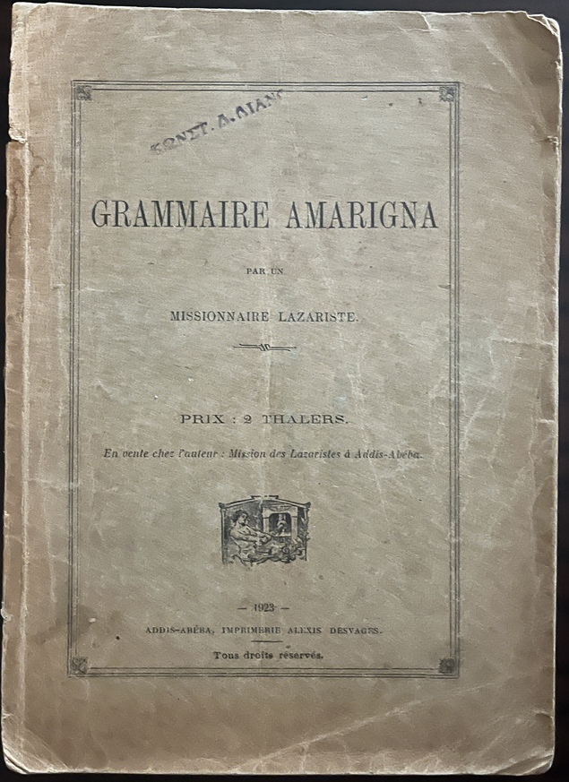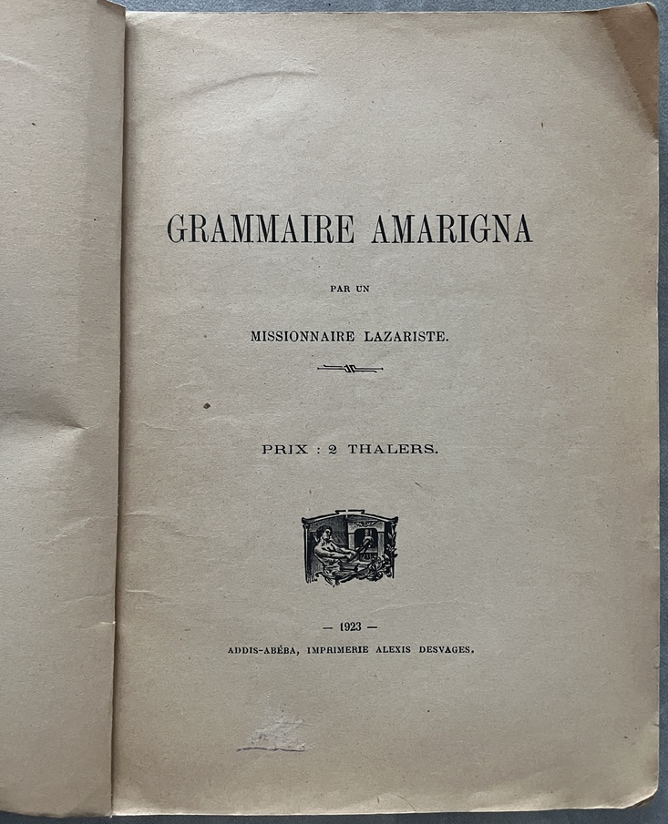 Very rare early Amharic grammar, titled Grammaire Amarigna, written by a Lazarist (Vincentian) missionary and printed in Addis-Ababa, Ethiopia, in 1923 by Imprimerie Alexis Desvages.