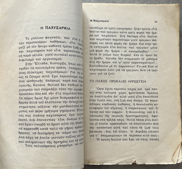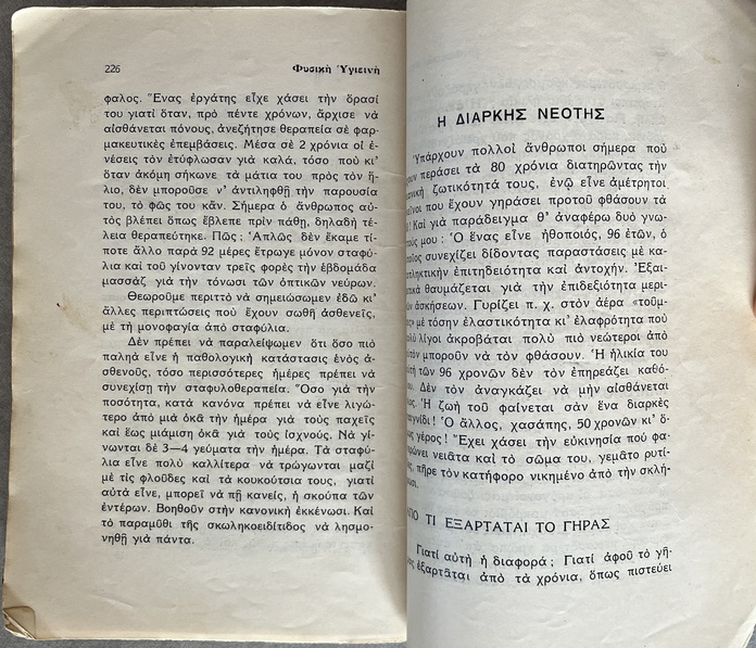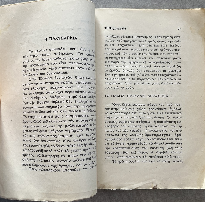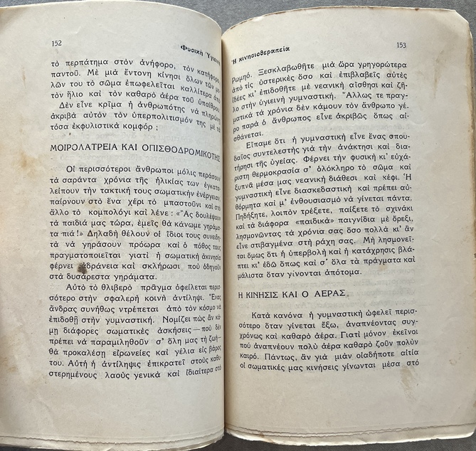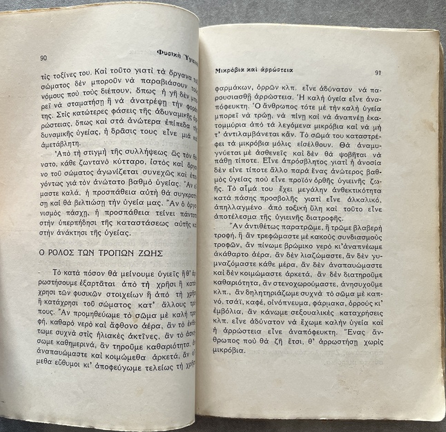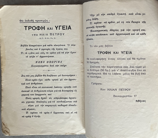 More than a standard health manual, this work functions as a manifesto of the Natural Hygiene movement in Greece. Petrou presents a radical, non-conventional approach to health and lifestyle, challenging established medical practices of the 1930s.