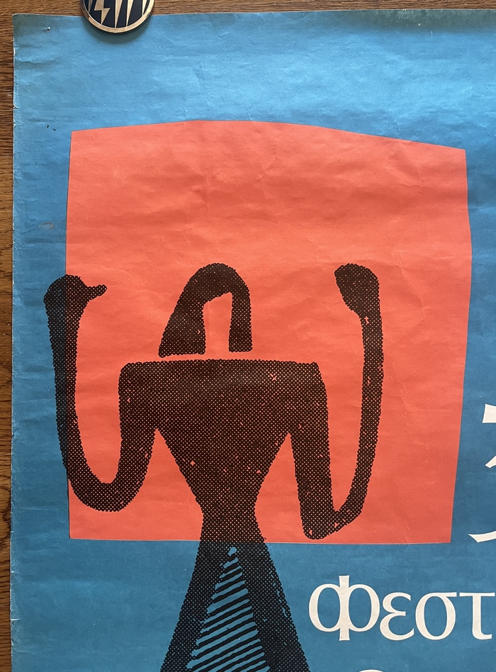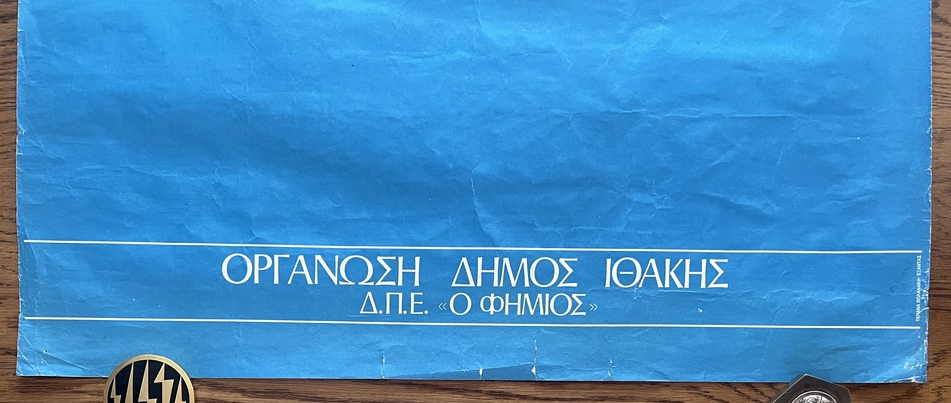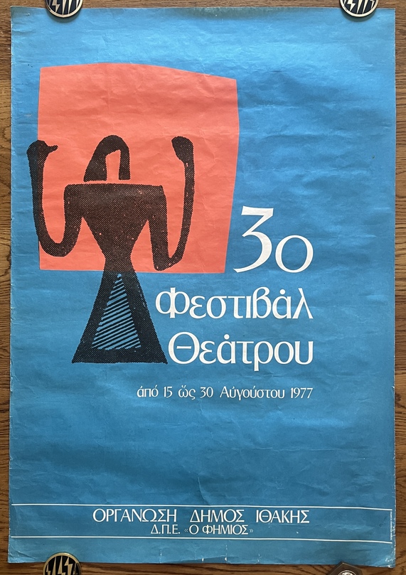 This is a rare and original vintage poster issued in 1977 for the 3rd Ithaca Theatre Festival, held on the Greek island of Ithaca from 15–30 August 1977.