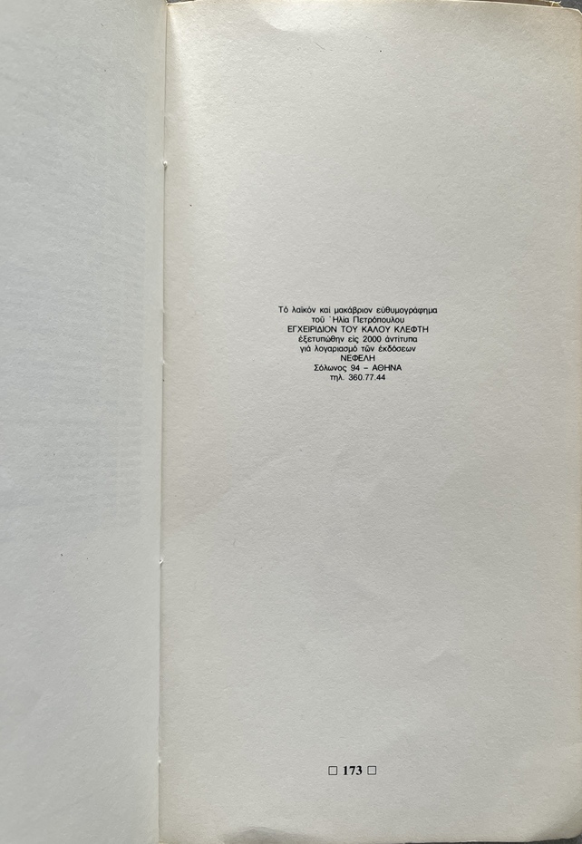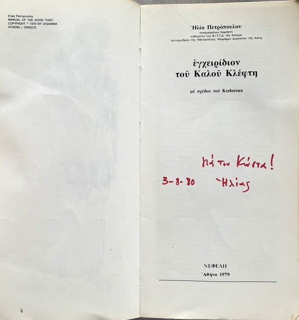 A rare signed first edition of Εγχειρίδιον του καλού κλέφτη (The Good Thief’s Handbook) by Ilias Petropoulos, published in Athens by Nefeli Editions in 1979 in a limited edition of 2,000 copies.