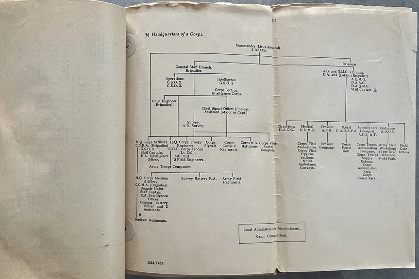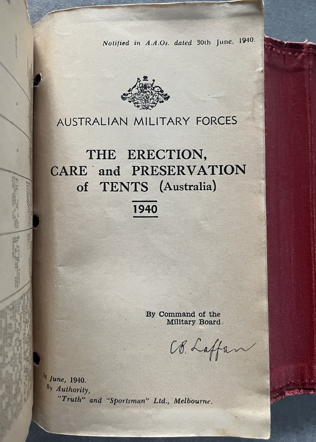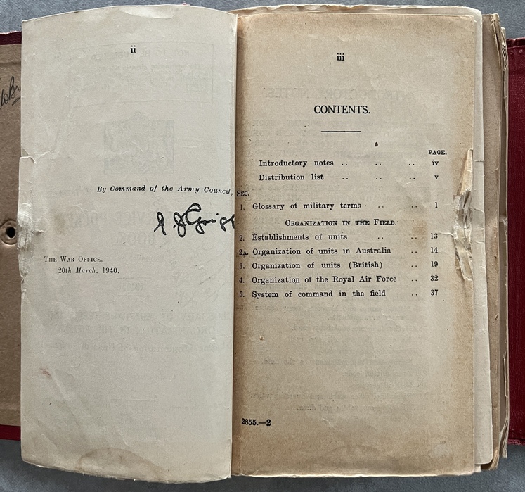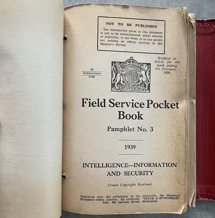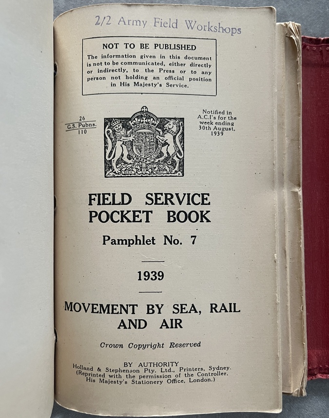 Includes multiple pamphlets (Nos. 1–13) and appendices covering all aspects of field operations: Pamphlet No 1 (Glossary of Military Terms and Organization in the Field) 1940, Pamphlet No 2 (Orders and Intercommunication) 1939, Pamphlet No 3 (Intelligence-Information and Security) 1939, Pamphlet No 4 (Field Engineering) 1939, Pamphlet No 5 (Billets, Camps and Bivouacs, Camp Cooking and Water Arrangements) 1939, Pamphlet No 6 (Mechanized Movement by Road) 1939, Pamphlet No 7 (Movement by Sea, Rail and Air) 1939, Pamphlet No 8 (Protection against Gas) 1939, Pamphlet Nr. 9 (Supply and Replenishment of Material in the Field) 1939, Pamphlet No 10 (Medical Services) 1939, Pamphlet No 11 (Discipline, Office Work and Burial Parties) 1939, Pamphlet Nr. 12 (Miscellaneous Tables and Data) 1939, Pamphlet 13 (Notes for Staff Officers) 1940, Specimen Standing Orders for Protection against Gas and Air Raids in Billets, Camps and Bivouacs for all Headquarters and Units Australian Military Forces 1939, Notes on the Administration of Discipline on War Service Part I + II 1939, Australian Military Forces – The Erection, Care and Preservation of Tents (Australia) 1940.