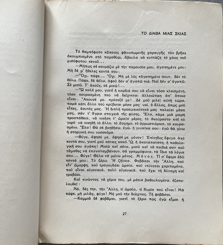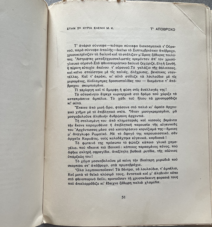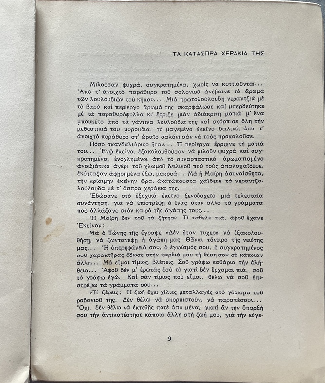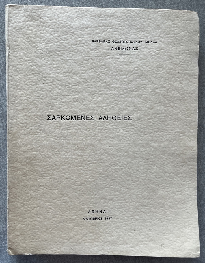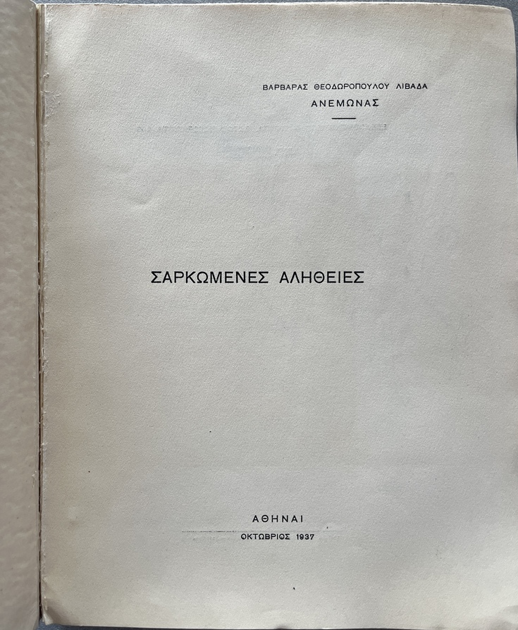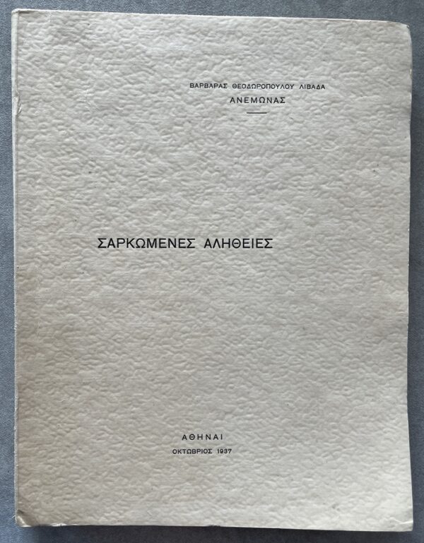 Self-published by Varvara Theodoropoulou-Livada under the pseudonym “Anemone,” the work forms part of the interwar literary production that sought to articulate social and moral experience through short narrative forms. The collection engages with themes of human struggle, sacrifice, and ethical tension, presenting what the author frames as “incarnate” or embodied truths drawn from lived experience.