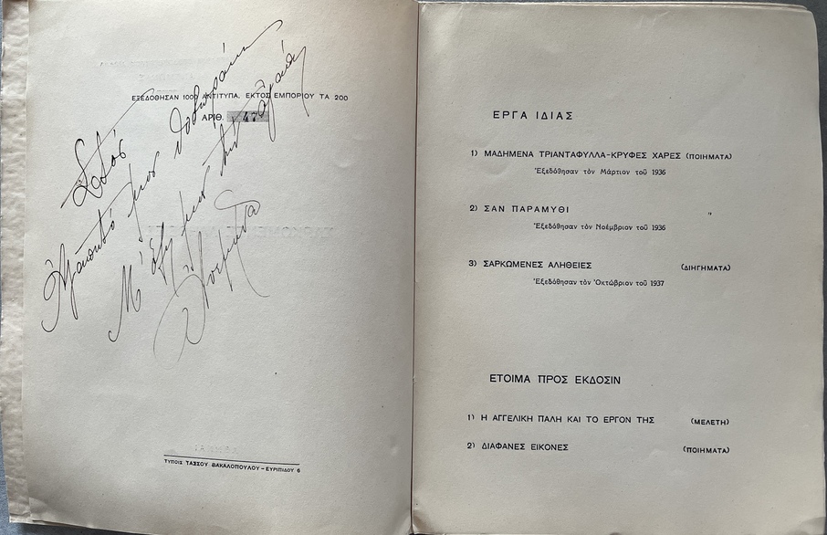 A rare, signed and dedicated copy of Σαρκωμένες Αλήθειες (“Incarnate Truths”), issued in Athens in 1937 in a strictly limited edition.