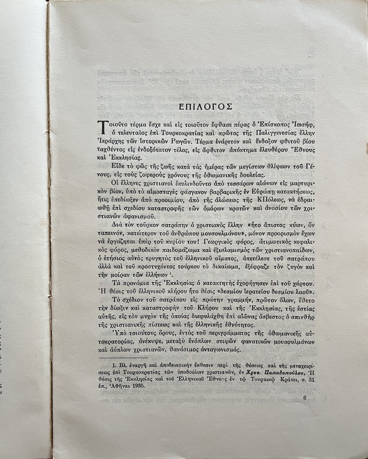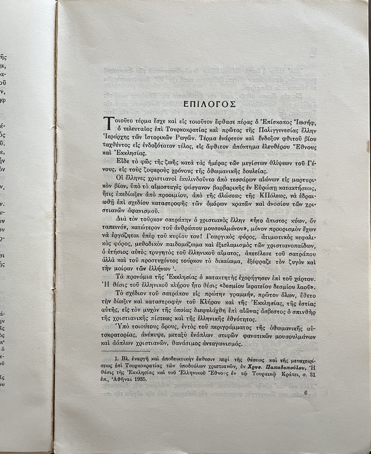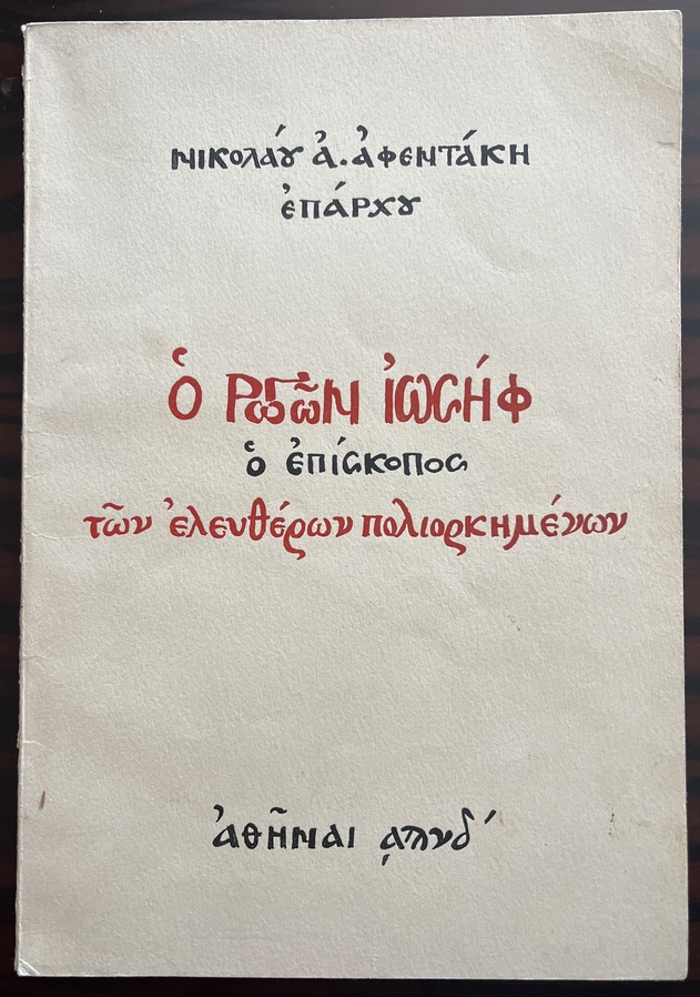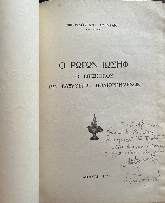 A rare and collectible signed first edition (1954) of “Rogon Joseph: The Bishop of the Free Besieged” by Nikolaos Antonios Aftentakis.